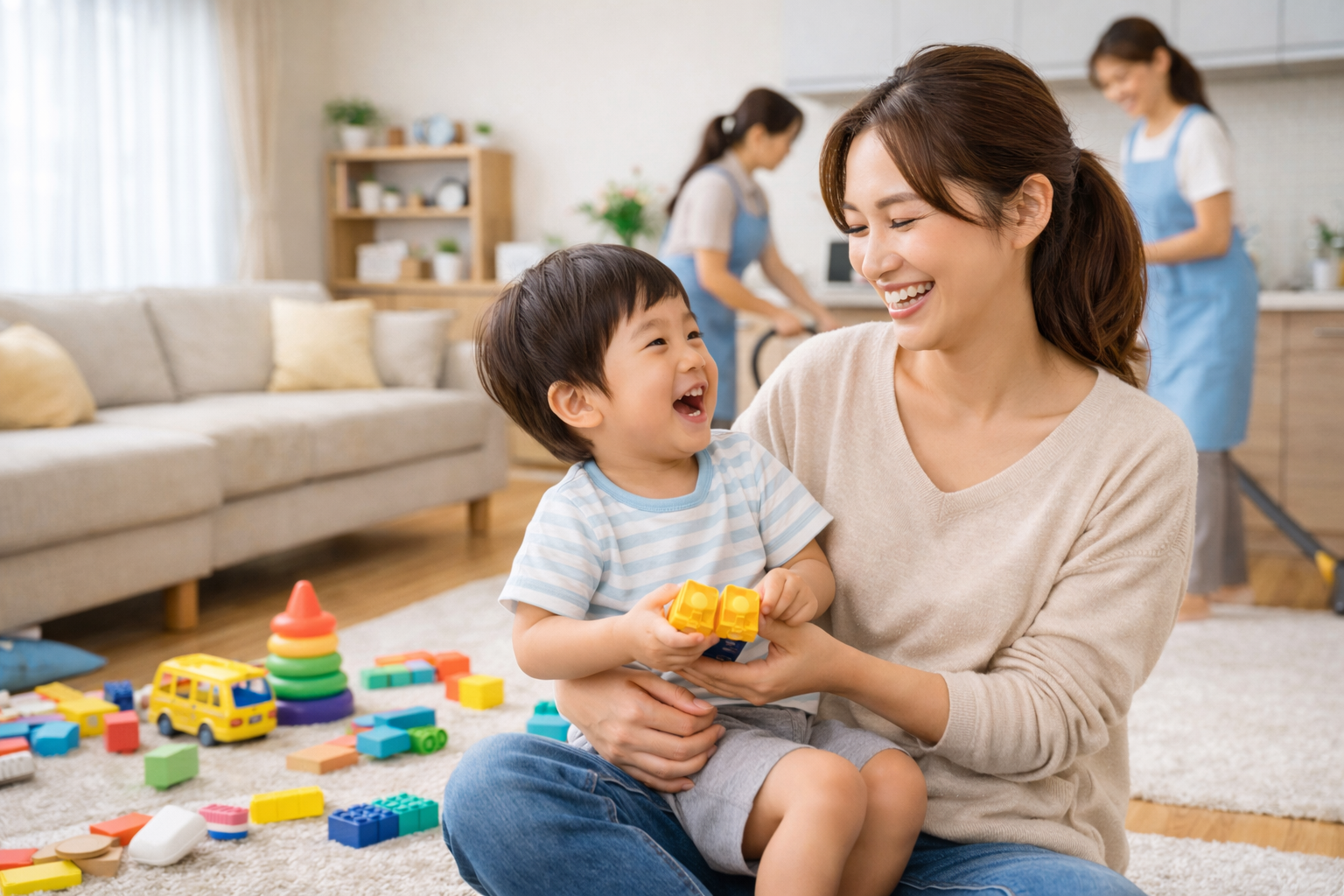 家事代行をお願いしたことで、しっかり自分の時間が作れるようになりました。 ゆっくり好きなことをしたり、体を休めたり。心にゆとりが生まれると、自然に笑顔が出るようになります。 部屋がきれいだと気持ちがいい。私が笑うと夫も笑う。夫婦が笑顔になると、子どもも本当に嬉しそうに笑ってくれるようになりました。